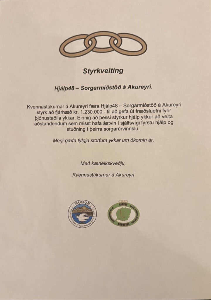 Kvennastúkurnar Auður og Laufey á Akureyri færðu Hjálp48 – Sorgarmiðstöð á Akureyri styrk í desember að fjárhæð kr. 1.230.000 til þess að þýða og gefa út stuðningsefni fyrir vitni, syrgjendur og viðbragðsaðila. Einnig er styrkurinn veittur til þess að veita aðstandendum sem misst hafa í sjálfsvígi aukinn stuðning.